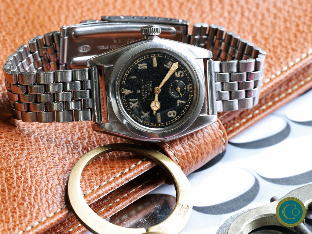 An exceptionally rare and possibly unique Rolex Flat-Back from 1939. Ref. 2765, featuring a black gilt Error-Proof dial—one of the rarest early Rolex dial configurations, and virtually unknown in double-signed form. To the best of our knowledge, only one example of this exact configuration is known.