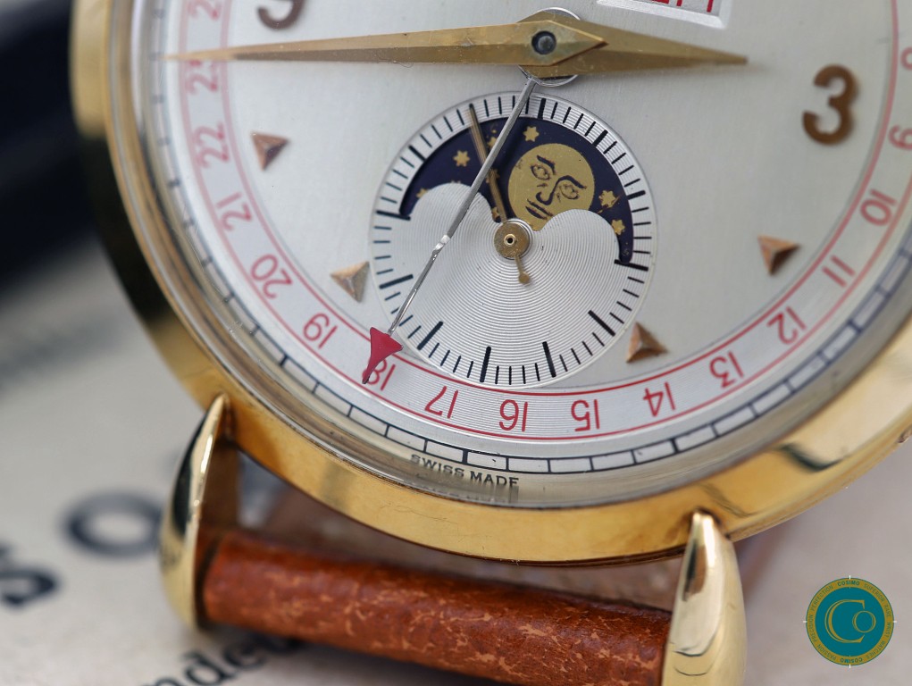 The watch is powered by Jaeger-LeCoultre’s hand-wound calibre P494/1A, a new old stock movement from the 1940s. It is housed in an 18K yellow gold, 36 mm case manufactured by Favre & Perret SA, La Chaux-de-Fonds — the same prestigious case maker that also produced cases for Patek Philippe, including the legendary 3700 Nautilus and 3940 Perpetual Calendar.