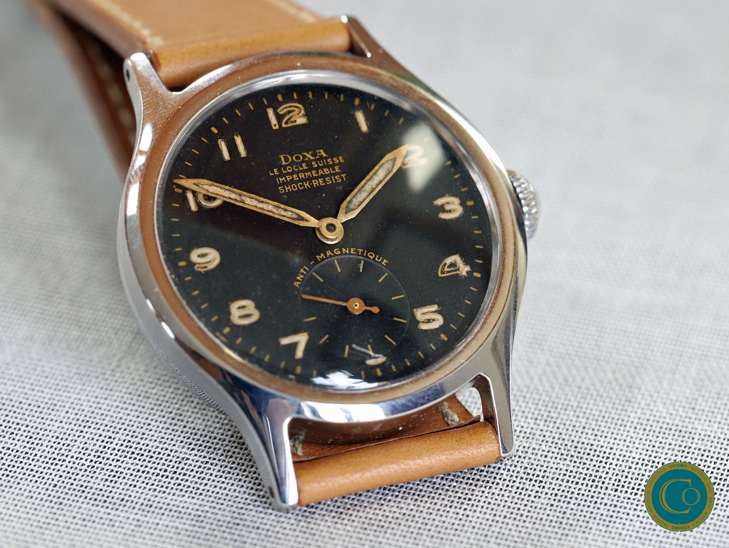 A rare and highly desirable Doxa from the 1940s, housed in a 35 mm stainless steel Borgel (FB) case — the same case manufacturer known for supplying the iconic Patek Philippe reference 565 and other important waterproof steel cases of the era.