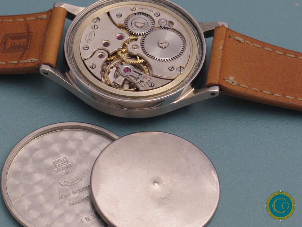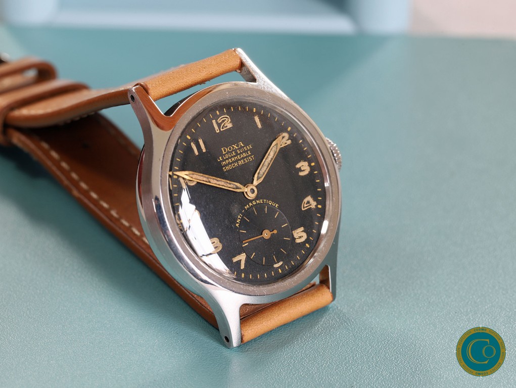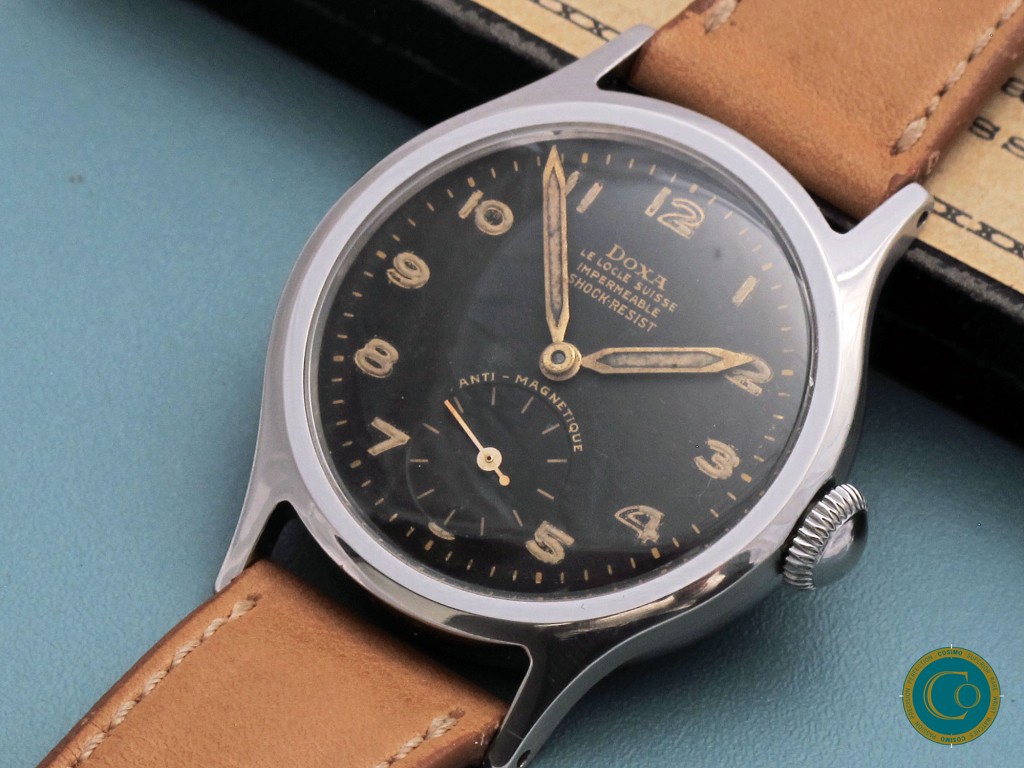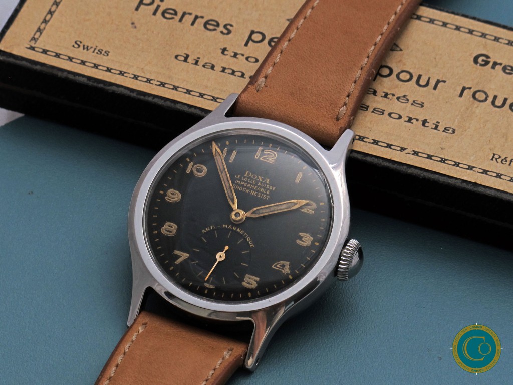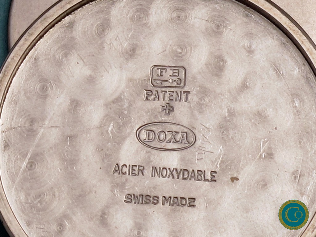 A rare and highly desirable Doxa from the 1940s, housed in a 35 mm stainless steel Borgel (FB) case — the same case manufacturer known for supplying the iconic Patek Philippe reference 565 and other important waterproof steel cases of the era.