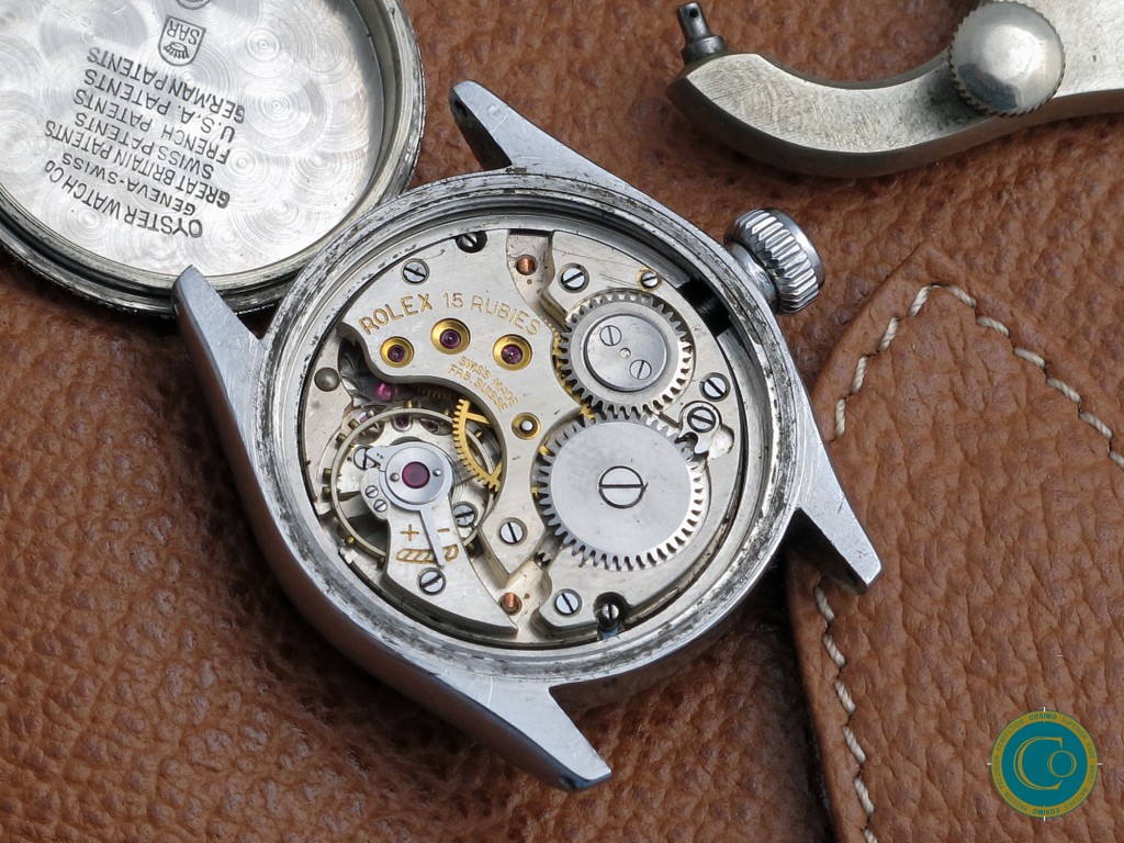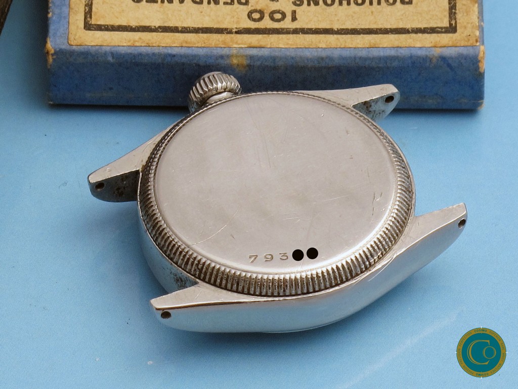 The stainless steel Oyster case remains strong with well-defined lines and a clean screw-down caseback. Inside caseback correctly signed “Oyster Watch Co Geneva”.