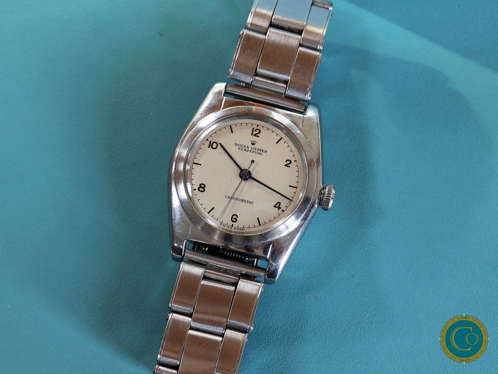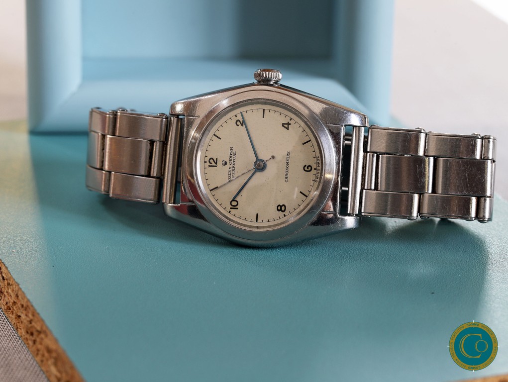 The case remains in excellent condition, showcasing the characteristic “Bubbleback” profile and fluid Oyster lines. This example is officially a Chronometer, as noted on the dial.